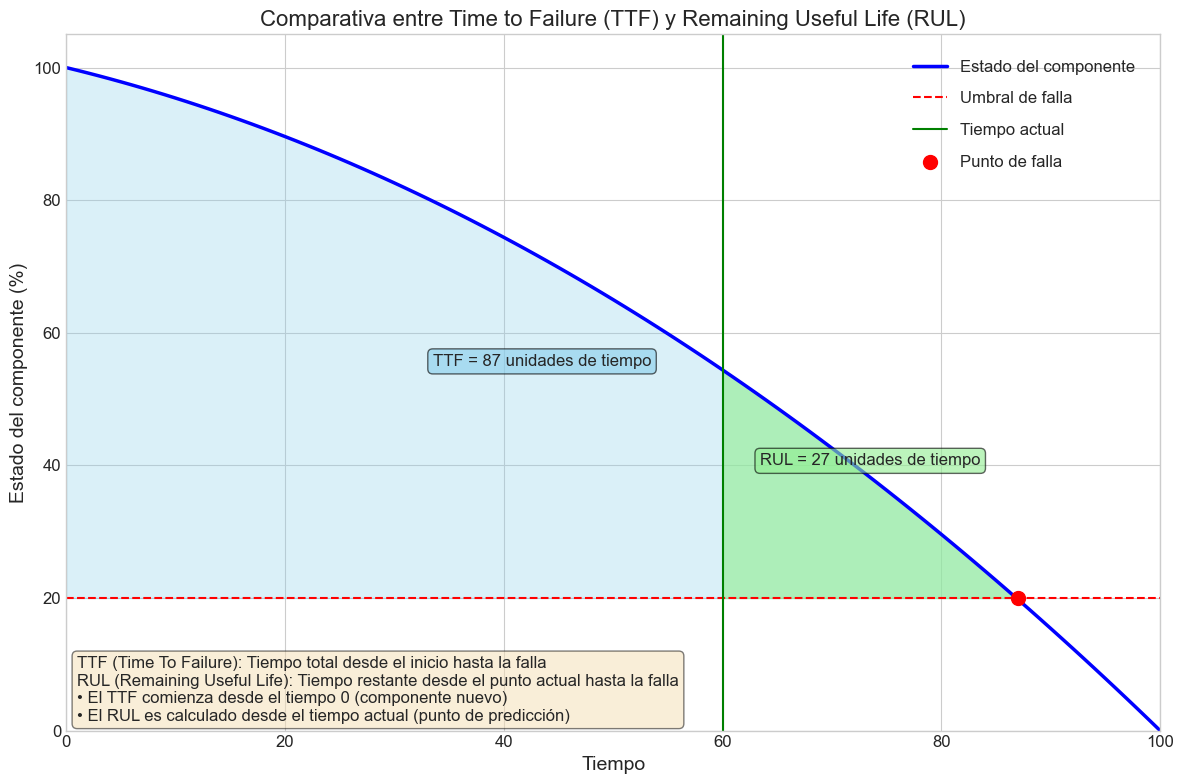 - Perspectiva: El TTF se enfoca en predecir el momento específico del fallo, mientras que el RUL se centra en la cantidad de vida útil que queda.